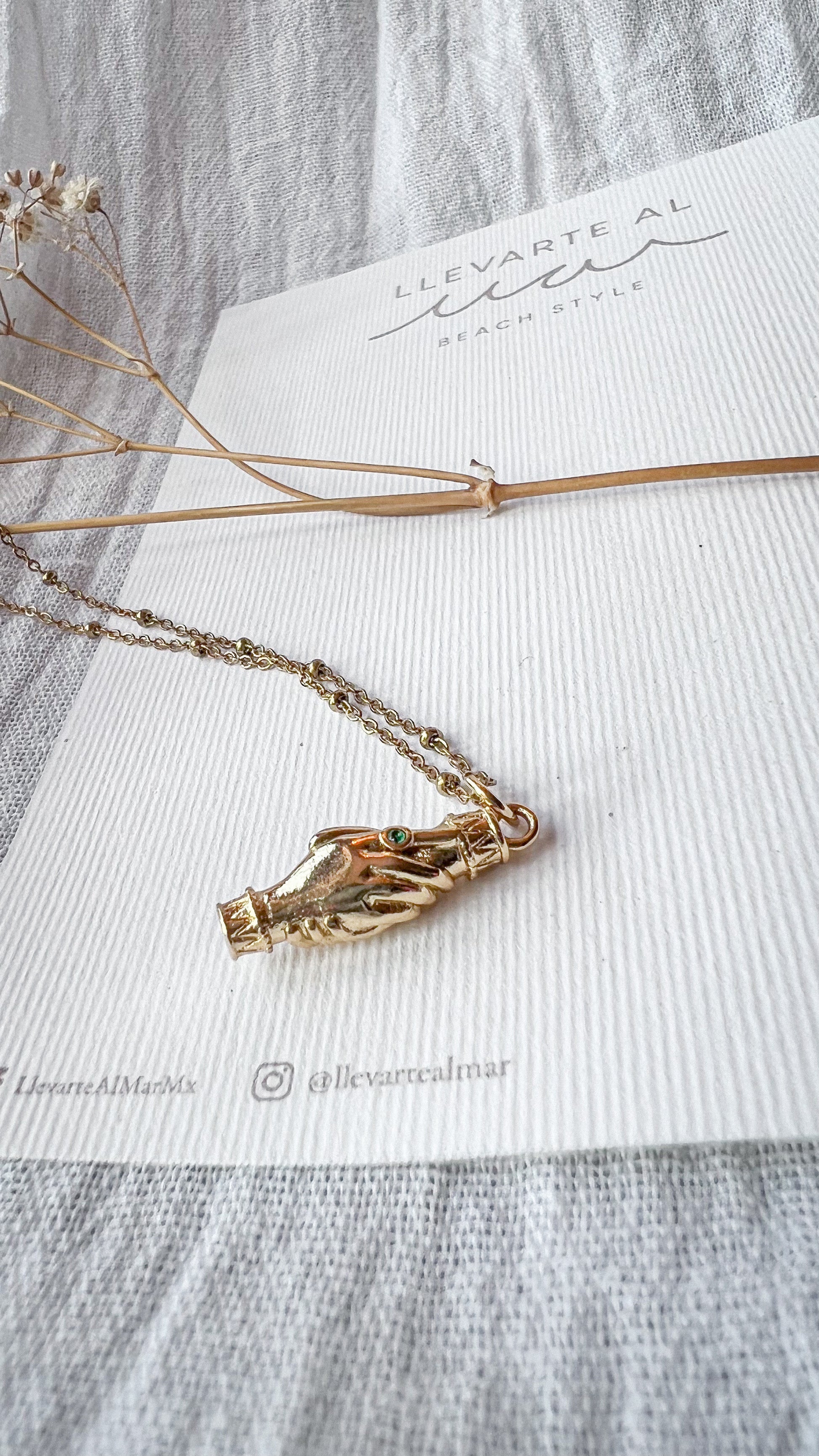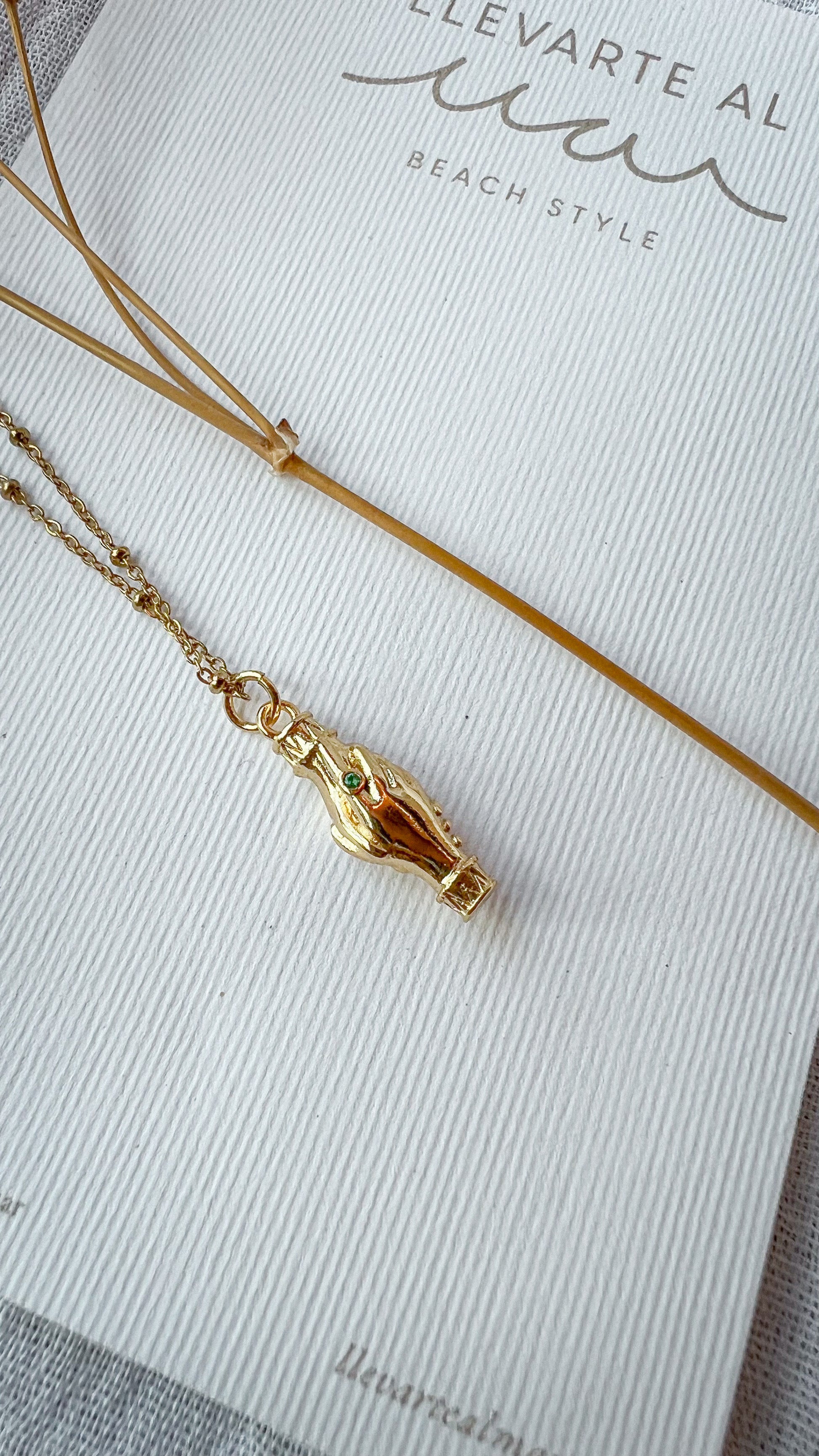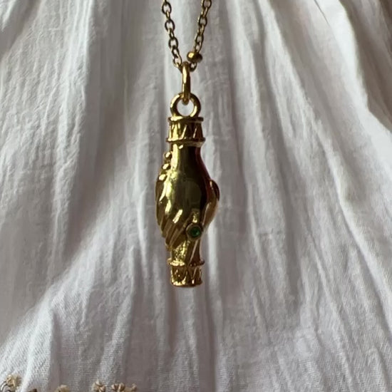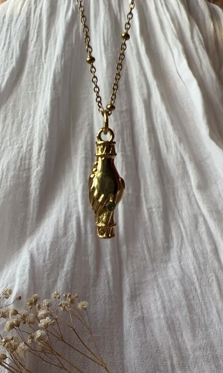 Cadena de acero inoxidable con dije en capa de oro 18k larga duración de dos manís estrechándose con circonias verdes.